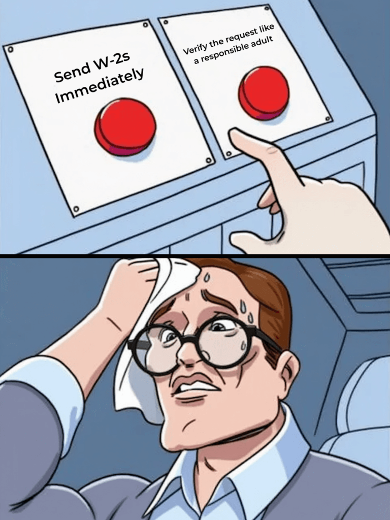 Make a “no W-2s via email” rule. Period. No exceptions. W-2s and other sensitive payroll documents do not leave your building through email attachments. If someone asks for them via email, the answer is “no,” even if it looks like the CEO.